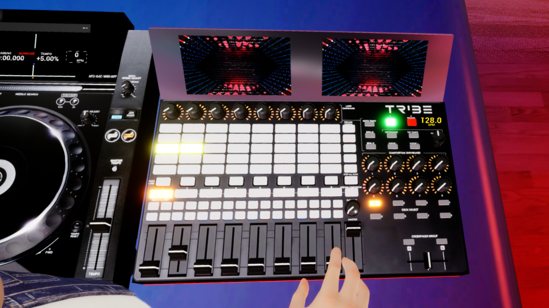 The VJ Controller allows you to drive live visuals in Resolume, with the ability to launch clips, control effects, sync tempo, and much more, all from within Tribe. Note, it requires that you have Resolume installed.