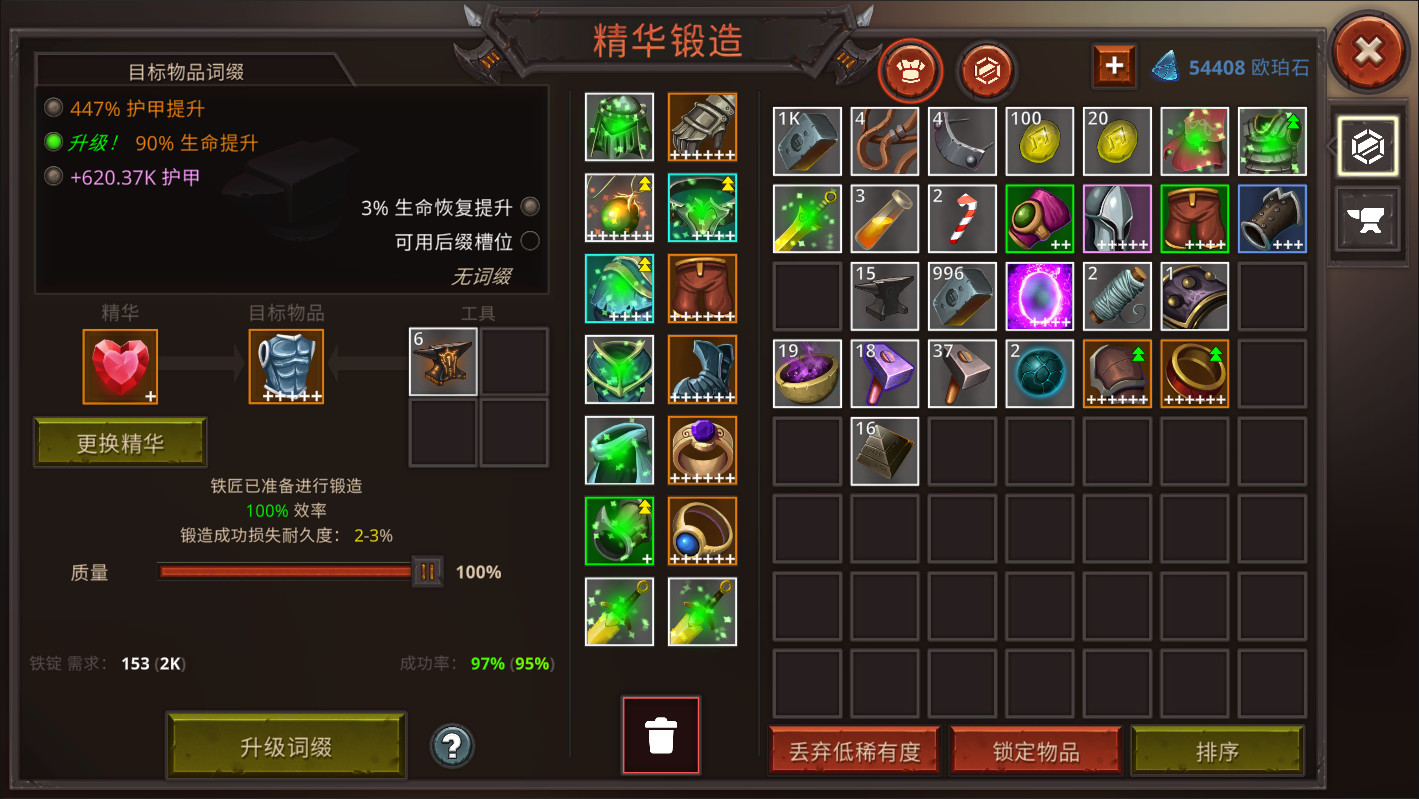 通过在铁匠处用精华将一个物品的数值合并到另一个物品上,拆解物品,并使用古老的遗物来进一步增强和修改你的装备!