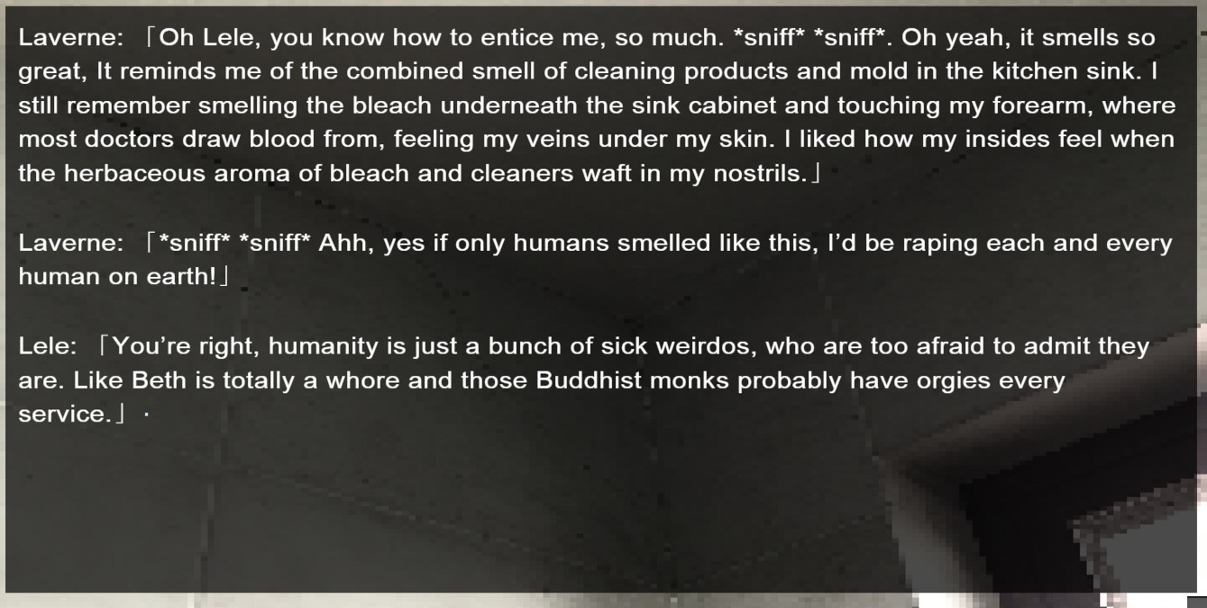 Trigger warning for themes, jokes/mockery, discussions, indications, and literary depictions of/about Rape, Elder Abuse, Beastiality, Coprophilia, Coprophagia, Urophilia, Podophilia, Pica, Bad Language, Racial Slurs, Smoking, Drug Use, Glue-Sniffing, Alcohol Abuse, Violence, Mental Disability, Physical Disability, Torture, Lesbianism, Flagellation, Religion, Religious Perversion, Misogyny, Misandry, Misanthrope, Other Sexual Themes, Violence, Feet Bounding, Self-harm, Human Trafficking, etc. If you are uncomfortable or are easily offended by such, it is strongly advised for you to not play this game or take it with a tremendous amount of salt. The game is made for a highly niche audience, and so it might not be everyone’s usual outing.