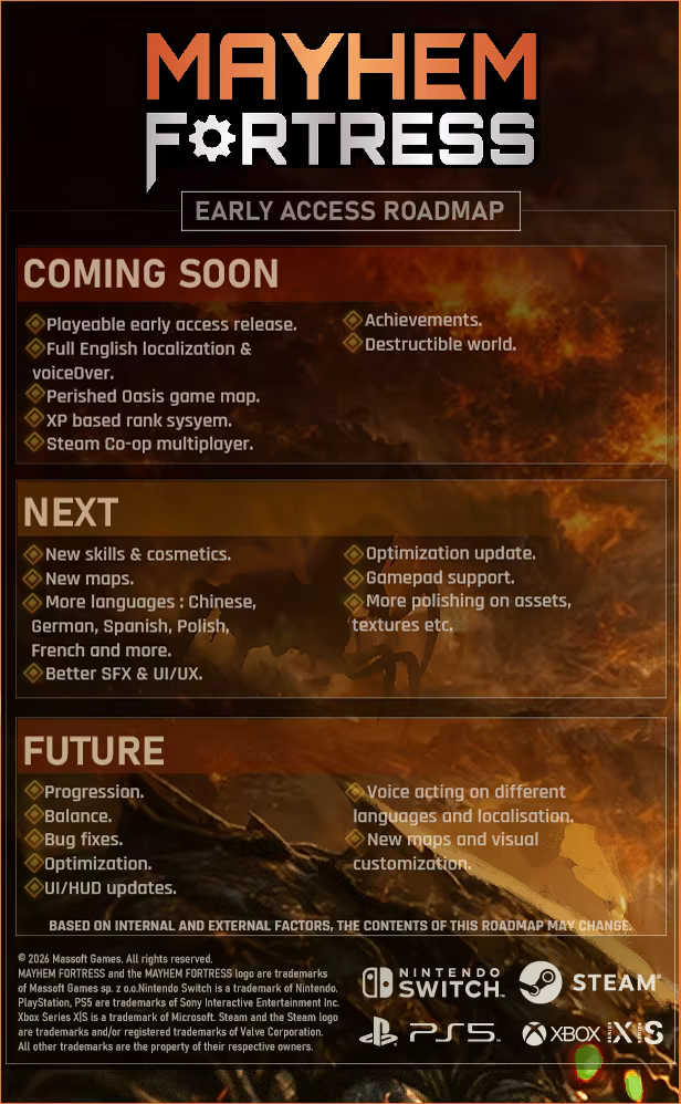Mayhem Fortress is actively in development, with more content planned including new missions, enemies, environments, and expanded gameplay systems. The battlefield will continue to evolve as we expand the world and deepen the combat experience.