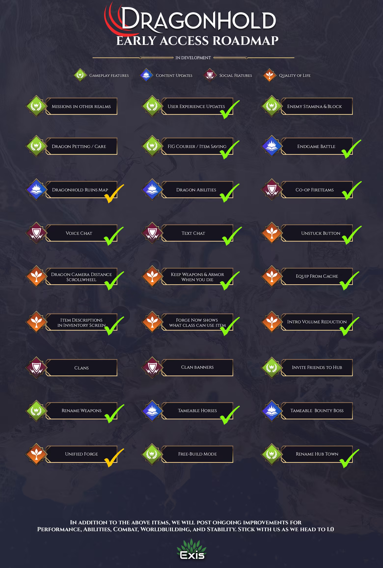 A: Our team has been building Dragonhold for years, and we’re committed to a full 1.0 release. We share our roadmap publicly and ship regular updates based on community feedback.
