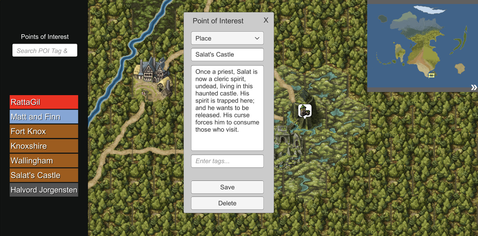 Points of interest bring your world to life. Take detailed notes about locations, player characters, parties, events, or items. POIs feature a tagging system that is searchable. Simply assign appropriate tags (such as the overarching kingdom, important rulers, characters, etc.) and search them when needed. Clicking on a searched POI jumps the camera to the POI's location.