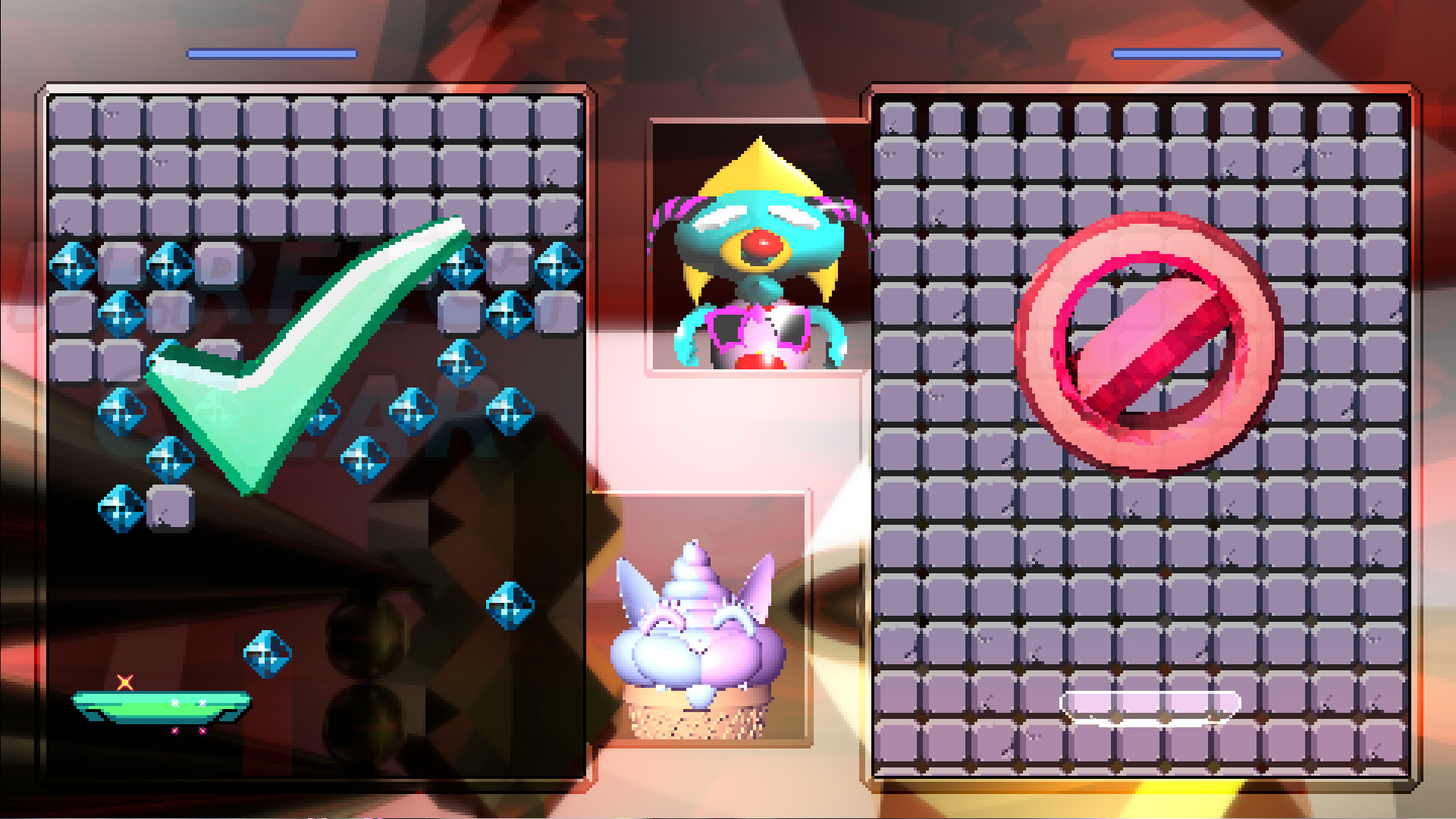 Two characters face head-to-head using their paddle and ball to shatter colour-matching gems and cascade rocks down on their opponent. Collect items and level up in Treasure Mode. Play through a visual novel-esque Story Mode. Or battle with a friend in 2P Mode!