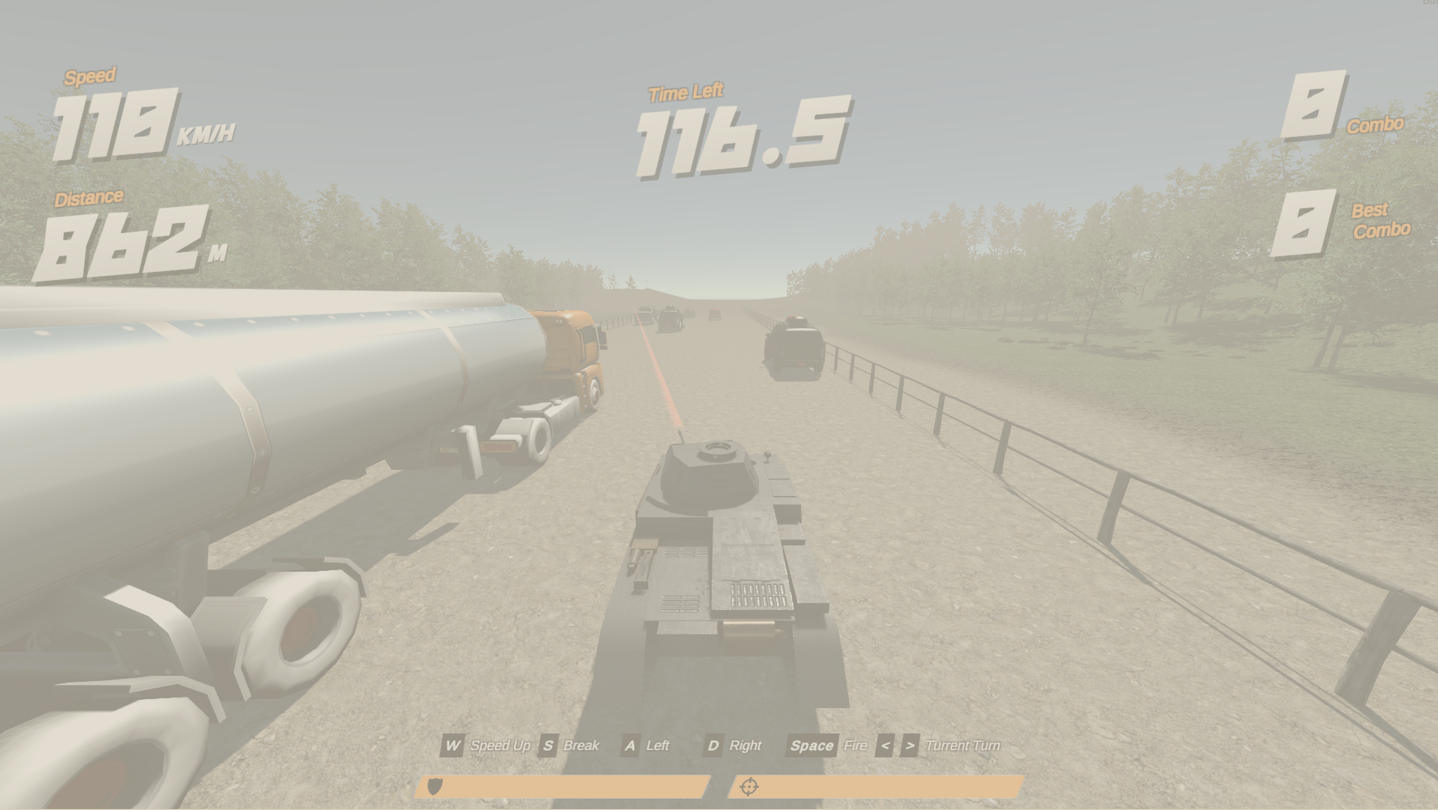 On the road, you'll encounter other vehicles blocking your way. Use your superior driving skills to avoid them, or turn your tank's cannon and blast them away.