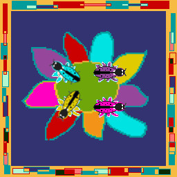 You find yourself in a game world where the characters are ladybirds that are on different flowers. The goal of the game is to make the characters appear on the same flower.