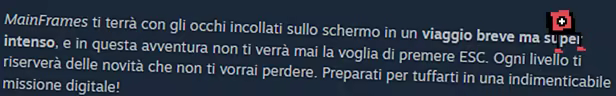 In MainFrames guiderai Floppy riorganizzando le finestre dei programmi per creare nuovi percorsi, e salterai da un PC all’altro per esplorare il mondo digitale. Ogni area che esplori è ricca di stili grafici, meccaniche innovative e segreti da scoprire. Il gioco presenta una colonna sonora micro-chill, avvincenti rompicapi e sfide platform che ti faranno divertire così tanto che non potrai più farne a meno.