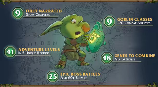 Manage a thriving goblin colony and build your lair chamber by chamber, from the Barracks to the War Room. Carefully breed your favorite goblins, combining the finest genes and traits to cultivate a formidable lineage.
