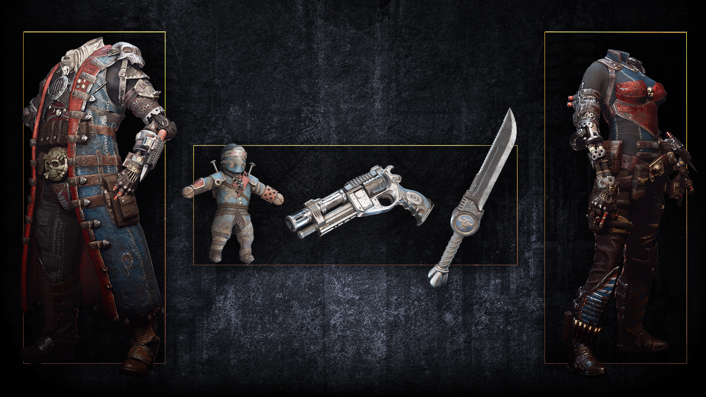The Hunter’s Bounty pack for Necromunda: Hired Gun comes with unique cosmetics for your knife, stub gun, outfit, and mastiff chew toy. Each has a Guilder theme, with a blue paintjob and hard metallic coating. The chew toy model replacement will help your cyber-mastiff chase down targets with efficiency, shaped like the delicious meat he’ll soon be biting into.