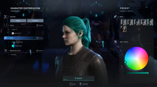 Choose your characters face, skin color, hair style, hair color, and also the design of your machine arm!