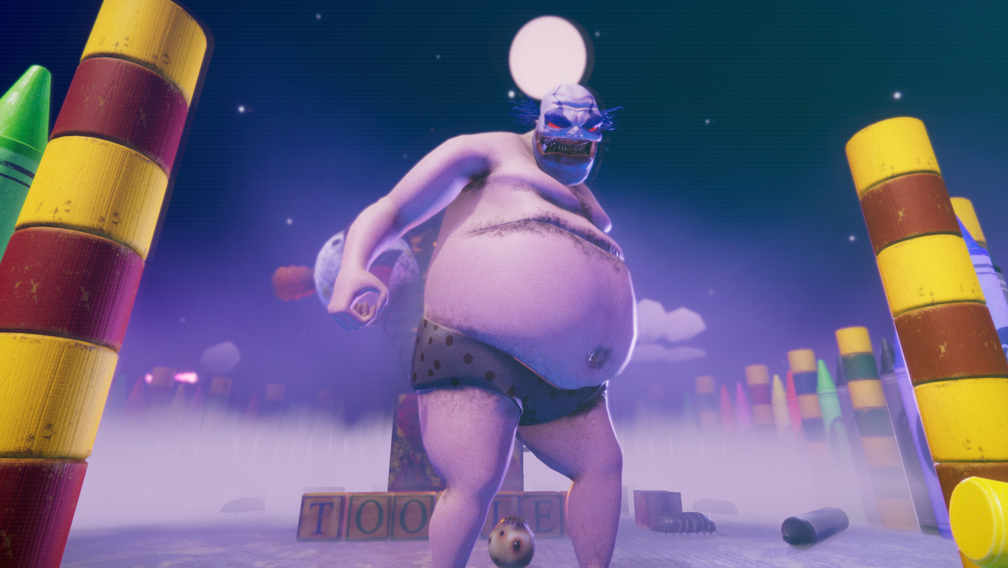 Gifted with the magical ability to throw stuff, the Player will use any resource available to defeat their bloated nemesis. Sacrifice villagers, transform and consume cute wildlife, do whatever it takes to survive until you have enough strength to bring down the clown.