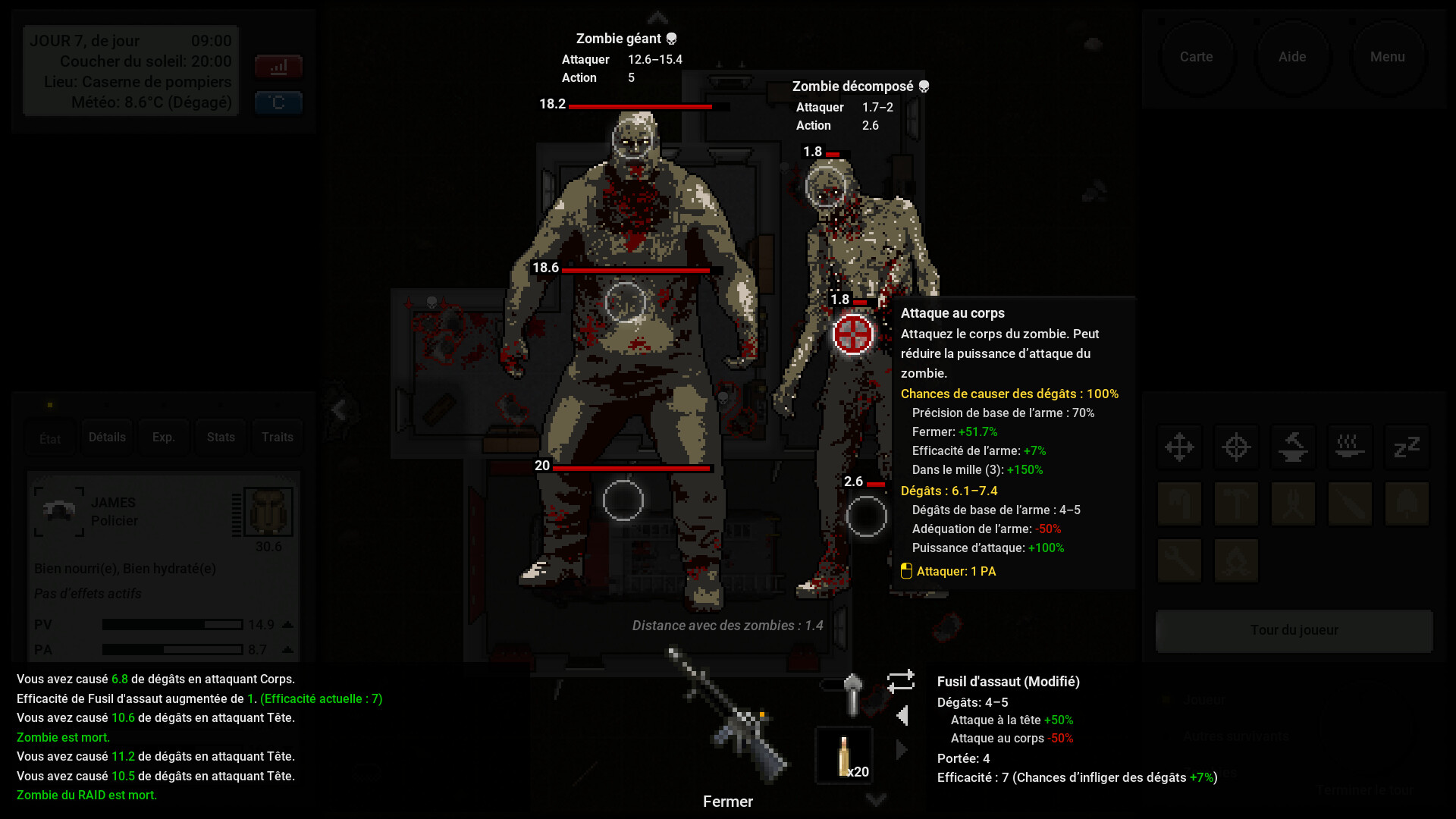 Choisissez soigneusement votre prochain mouvement ! Chaque mouvement, action et décision que vous prenez réduit vos points d'action (PA). La gestion stratégique de vos PA est la clé de votre survie. Si vous en utilisez trop peu, vous risquez de ne pas trouver les ressources nécessaires à votre survie. Si vous en utilisez trop, vous risquez d'être attaqué.