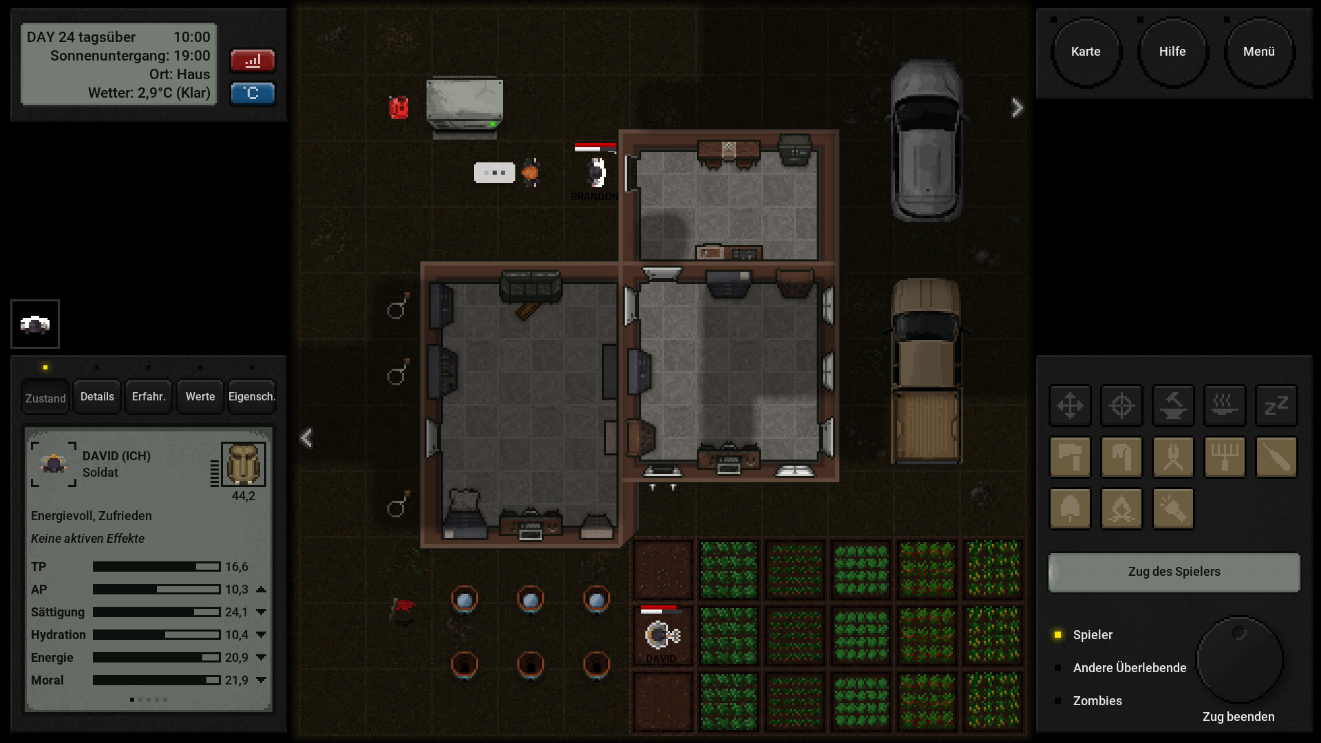 Überlege dir deinen nächsten Zug gut! Jede Bewegung, jede Aktion und jede Entscheidung, die du triffst, zieht dir Aktionspunkte (AP) ab. Der strategische Umgang mit deinen AP ist der Schlüssel zum Überleben. Wenn du zu wenig einsetzt, findest du vielleicht nicht die Ressourcen, die du zum Überleben brauchst. Setzt du zu viele ein, bist du möglicherweise angreifbar.