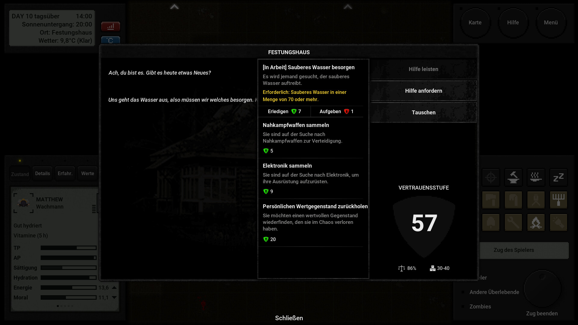 Überlege dir deinen nächsten Zug gut! Jede Bewegung, jede Aktion und jede Entscheidung, die du triffst, zieht dir Aktionspunkte (AP) ab. Der strategische Umgang mit deinen AP ist der Schlüssel zum Überleben. Wenn du zu wenig einsetzt, findest du vielleicht nicht die Ressourcen, die du zum Überleben brauchst. Setzt du zu viele ein, bist du möglicherweise angreifbar.
