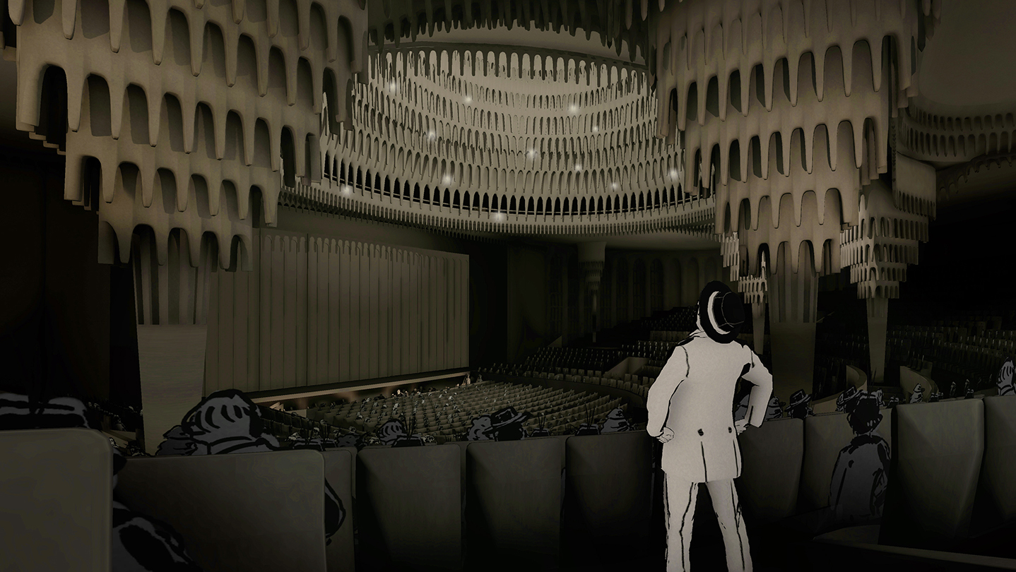 Three protagonists each invite us to join them on their unique journey down memory lane at the Grosse Schauspielhaus in Berlin. First time visitor Walter Schatz accompanies us through the impressive foyers and the colossal auditorium; celebrated singer Fritzi Massary offers a peek into the cosmos of a star; young lighting technician Otto Kempowski guides us through the fascinating world of theatre engineering. Thus we peer through a digital window to visit the famous theatre’s past and explore its art and architecture spatially in the here and now.