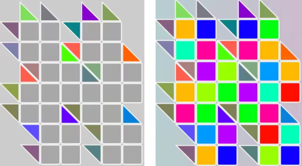 The triangles are the color clues the player uses to figure out which colors to place into the empty squares. Each grid square is a part of a vertical and horizontal clue. The color selection area has nine colors which are equidistant from each other on the RGB color wheel. This is so mixing colors didn't result in a lot of browns and greys. Also important to notice how the greens look kind of similar. In a lot of levels, the greens are almost indistinguishable from each other, but the way they mix with other colors are very different. This area also contains a lot of helpful tools that will make sure no player gets stuck on a level.