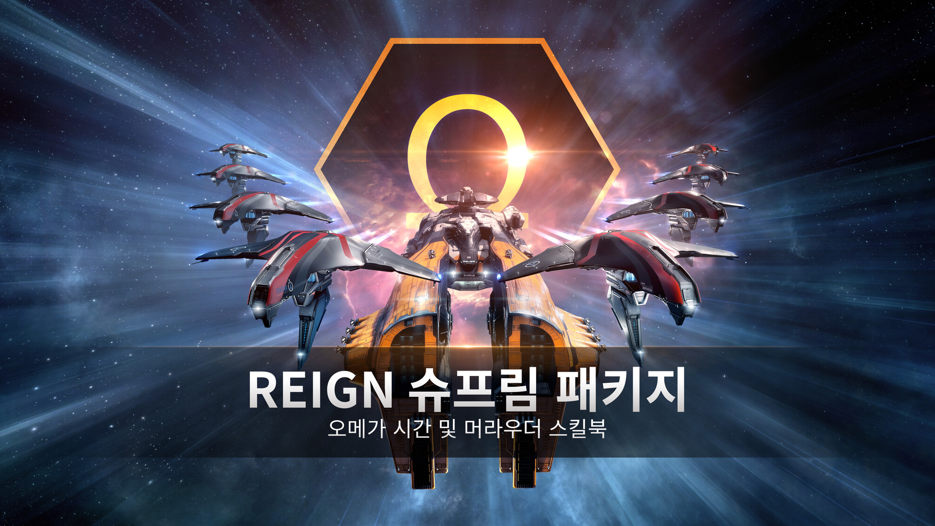패키지에는 오메가 30일, 머라우더/리콘 전용 스킬북, 그리고 9가지 함선 SKIN이 포함되어 있습니다.