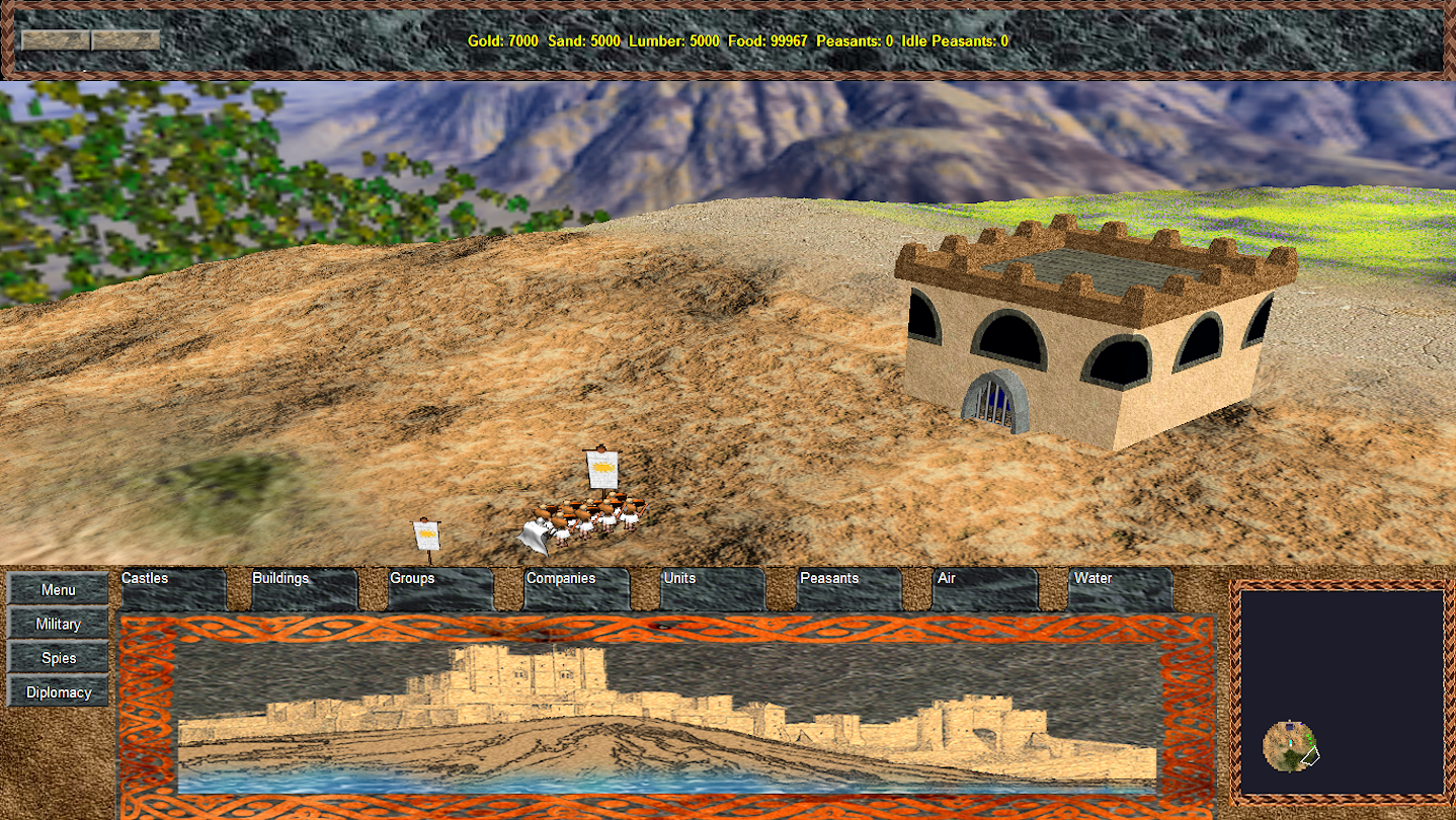SAND CASTLES is a Kingdom and Castle Building Real-Time Strategy / 4X game with a full 3D Graphics Engine. The game supports up to 6-players (human player or computer Artificial Intelligence). The game features true fog of war within the 3D game world. Your available resources are Gold, Sand, Lumber, and Food.