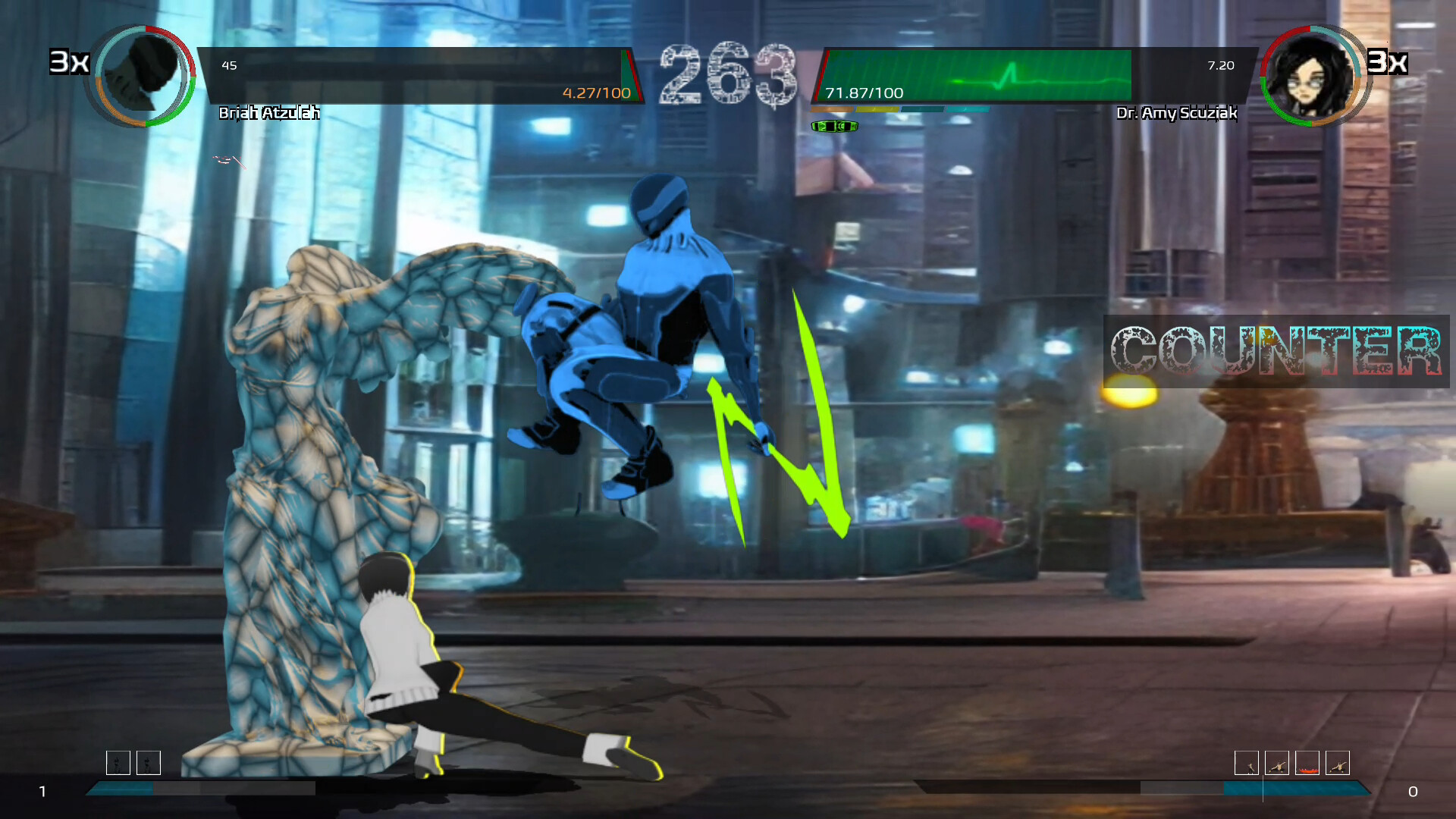 Evolver’s combat mechanics are unique among 2D fighting systems in that it combines elements of traditional fighters with those of platform fighters. It also replaces traditional blocking with a unique evade-and-parry based defense system. Additionally, players choose their attack sets before each round with each character having 15 unique moveset combinations. Evolver’s combo system is friendly to inexperienced players and button mashers thanks to it’s auto combo mechanic, but also rewards seasoned fighting game players who put the time into creating complex attack sequences and mixups.