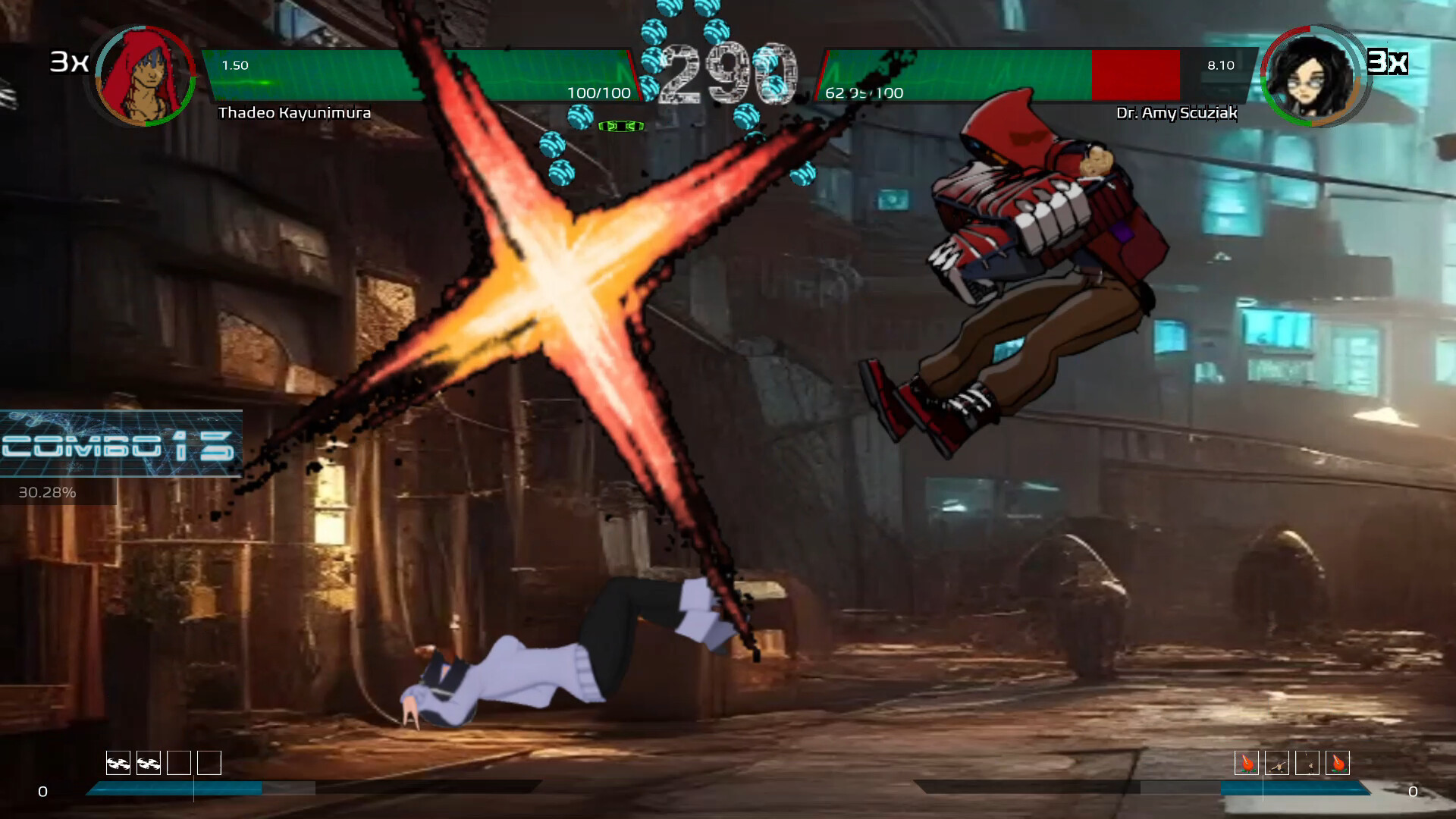 Evolver’s combat mechanics are unique among 2D fighting systems in that it combines elements of traditional fighters with those of platform fighters. It also replaces traditional blocking with a unique evade-and-parry based defense system. Additionally, players choose their attack sets before each round with each character having 15 unique moveset combinations. Evolver’s combo system is friendly to inexperienced players and button mashers thanks to it’s auto combo mechanic, but also rewards seasoned fighting game players who put the time into creating complex attack sequences and mixups.