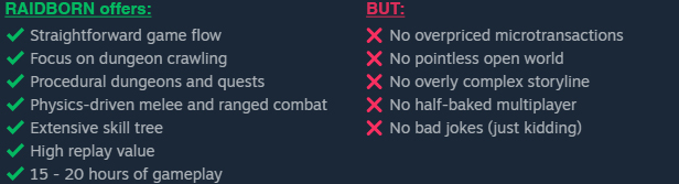 Enough of wasting precious time by walking eternal distances and engaging in endless dialogue? Want to get to the fun part quickly? Say no more! RAIDBORN should be right up your alley.