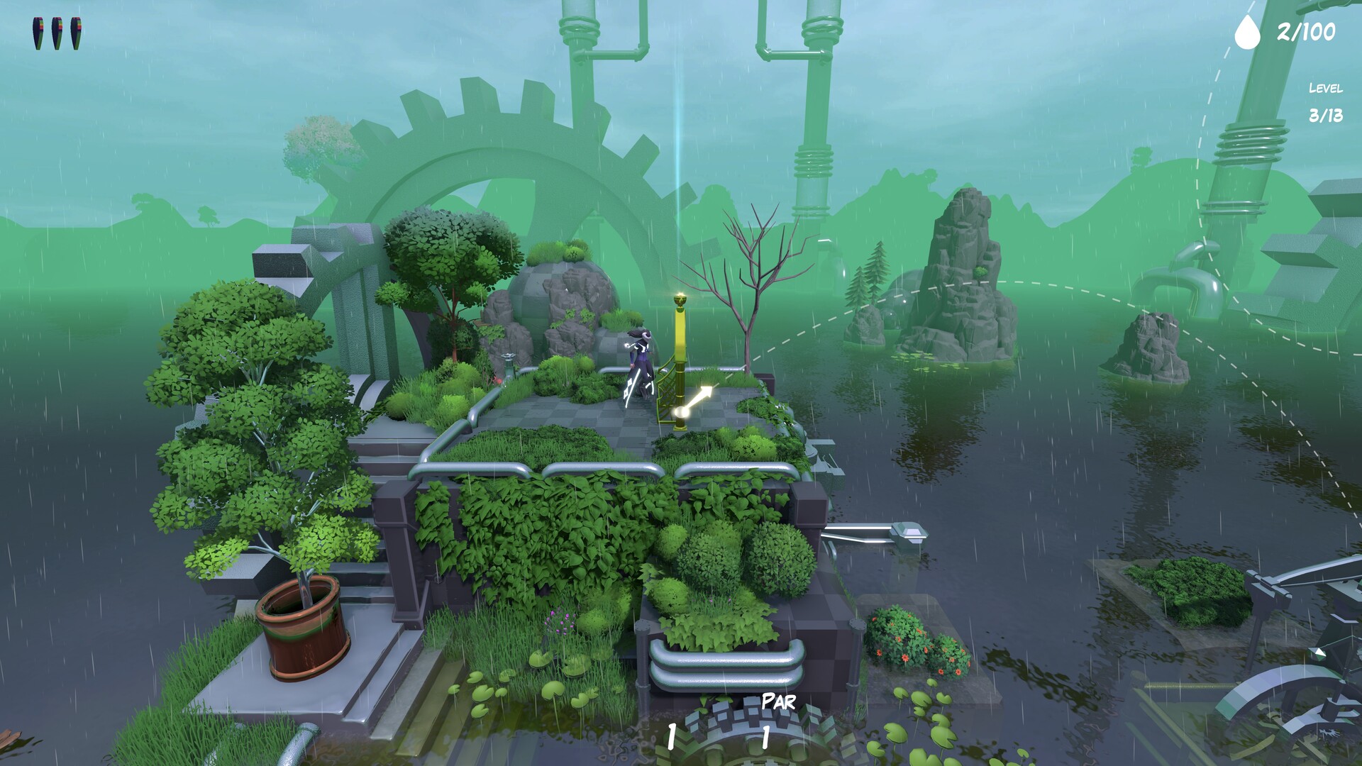 Shots can cling to jelly walls, bounce off bubbles, be propelled by explosions, and float on clouds. Living bushes can block the shots. Some puzzles even hide secret collectibles & lore tied to the game’s true ending.
