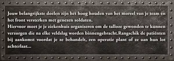 Je staat aan het hoofd van een veldhospitaal tijdens de Eerste Wereldoorlog en neemt de nodige beslissingen om de soldaten te laten overleven en het front te ondersteunen. In deze managementgame ben jij het laatste bolwerk van hoop voor de mensheid.