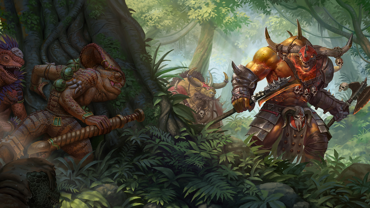 A chameleon Skink of high renown, Oxyotl has a long history of fighting – and succeeding against – the otherworldly forces of Chaos. His prescience enables him to detect where the forces of chaos will strike next and, utilising the network of lost Silent Sanctums across the world only he can capture and develop, Oxyotl can choose which threats to tackle, and reap the rewards of victory. Oxyotl can instantly travel between his capitol, his unique mission areas, and any Silent Sanctums he has rediscovered. Ultimately, he must travel to the Heart of the Dark and face the hordes of Taurox in a final, desperate battle.