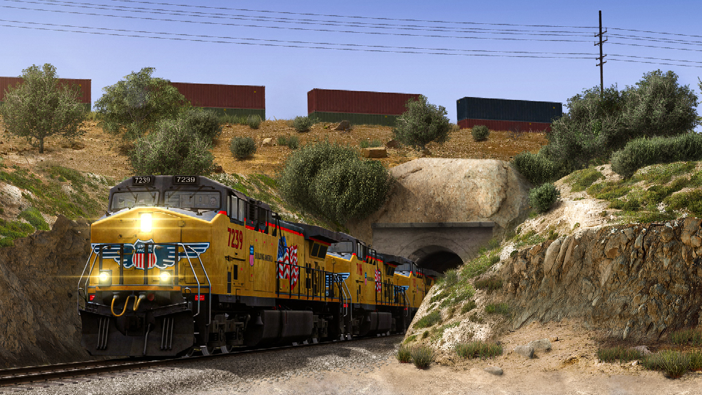 With a steady flow of intermodal, unit train, and manifest freight traffic tackling twisting grades of 2.2 percent, Tehachapi has long been home to big motive power and the Train Simulator route features Union Pacific’s General Electric AC4400CW and ES44AC diesels along with Electro-Motive SD70ACe and GP40-2 diesels as well as BNSF GE ES44DC power. And the route includes a variety of contemporary intermodal and freight rolling stock.