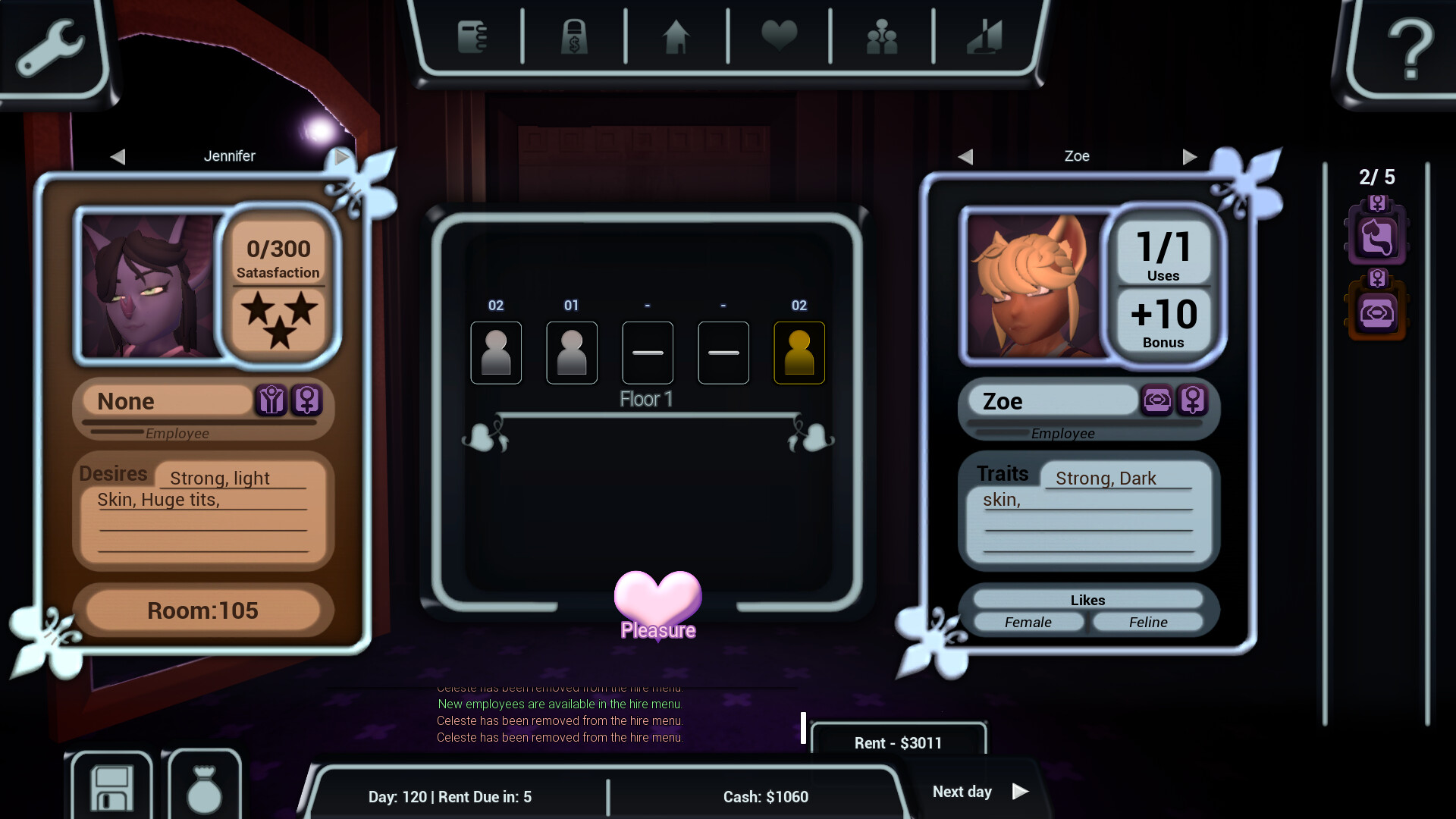 Every Character and guest in Extended Stay is completely randomly generated from breast size to personality and sexual preference. Every employee you hire will fill a unique role in your brothel satisfying specific desires for your guests. As your employees work they'll gain experience and gain a better skill-set to please your guests, they'll also become attracted to other employees you've hired. Once an employee gains enough attraction you'll be able to pair two employees together in a sex scene of your choosing. The sex scenes in Extended Stay are fully interactive, putting you in control of the action, using your mouse you can control the speed and motion of all 16 unique sex positions.