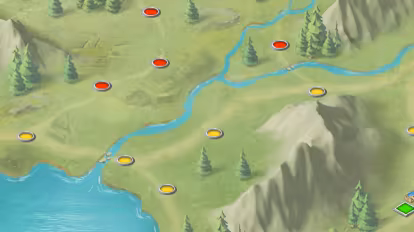 1、 The game contains a variety of natural features of the area, a large number of towns and wild exploration points, wild exploration points have common areas (yellow) and dangerous areas (red), dangerous areas of the beast will be more powerful, and they will block you through the area.