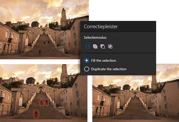 Mit diesem extrem schnellen Korrekturwerkzeug entfernen Sie Mängel und klonen oder füllen einen Bildbereich mit einem einzigen Mausklick. Schwer "rekonstruierbare" Bereiche lassen sich jetzt noch einfacher überarbeiten. Selbst in komplexen Bildbereichen (wie Stufen, Farbtönen im Himmel etc.) können Elemente hinzugefügt oder entfernt werden.