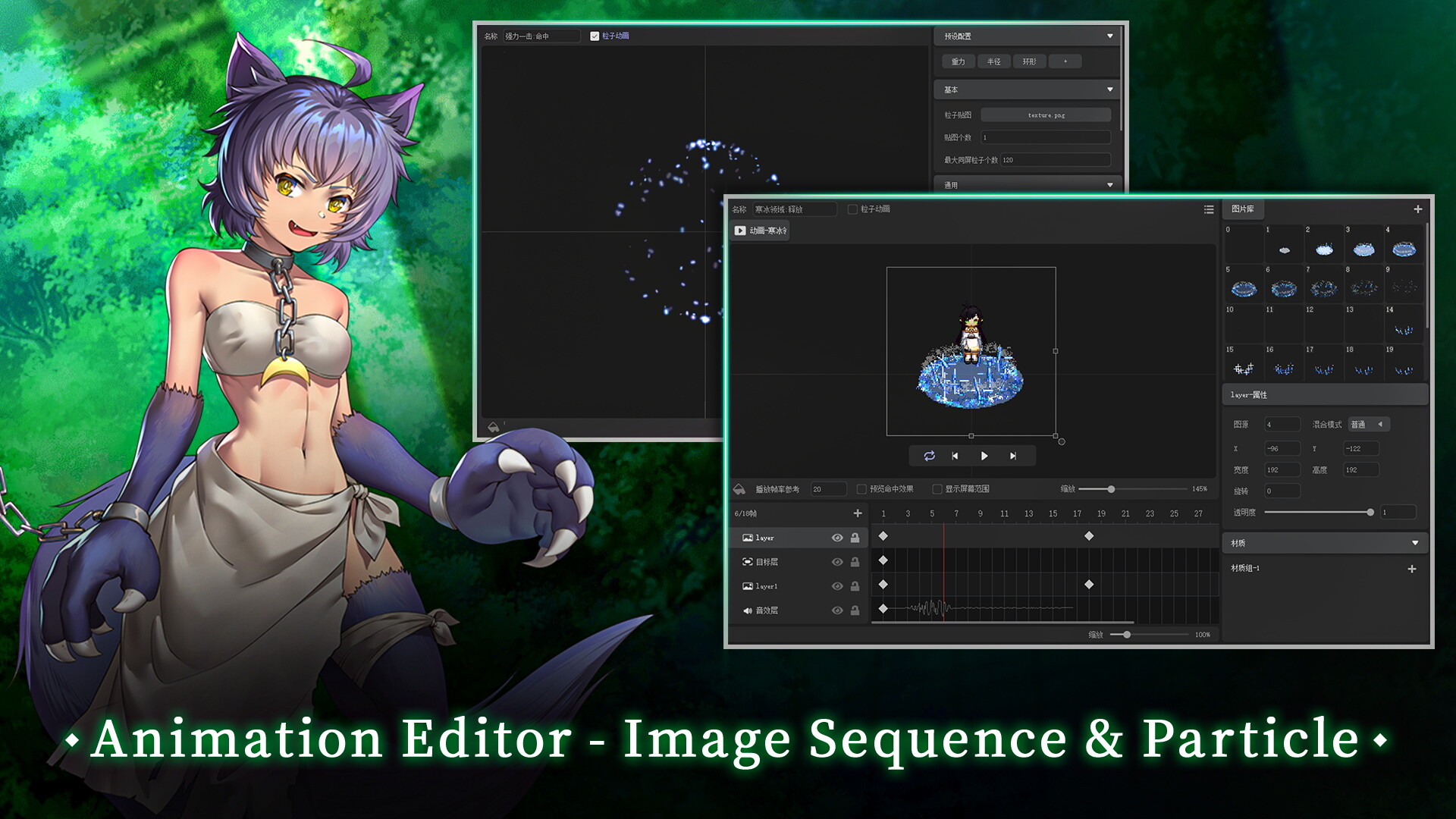 ●Frame Sequence Animation. The animation editor can help you quickly set keyframes in image and audio assets to create animations. It also supports auto filling function, making your animation smooth and fluent.