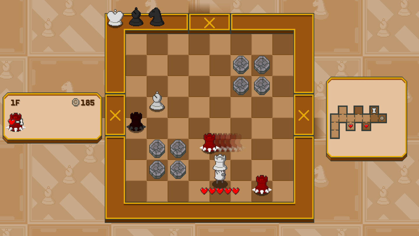 Defeat a variety of enemy types and boss fights in Adventure Mode, inspired by the movement patterns of chess pieces. Avoid charging Rooks, don't get shot by Bishops' diagonal projectiles, and watch out for stomping Knights.