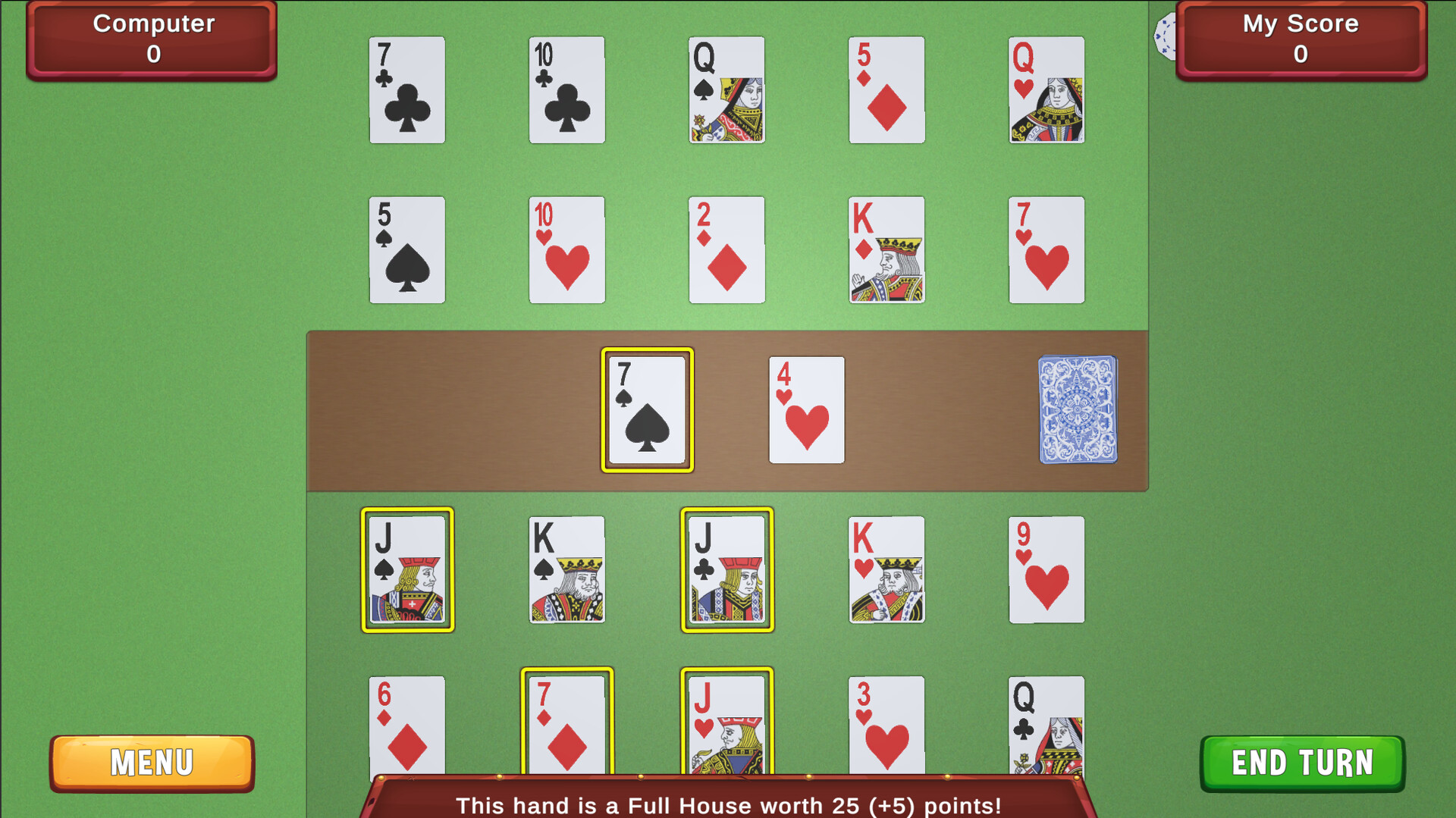 Each poker hand you build is worth a certain amount of points. The player with the most points after 5 rounds wins. You can play by yourself, with a friend by creating/joining a private room, or against a random player with the Quick Match option.