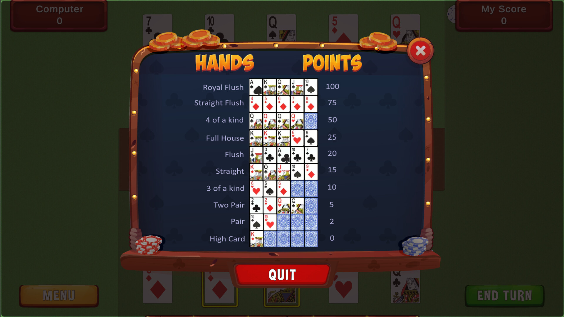 Each poker hand you build is worth a certain amount of points. The player with the most points after 5 rounds wins. You can play by yourself, with a friend by creating/joining a private room, or against a random player with the Quick Match option.