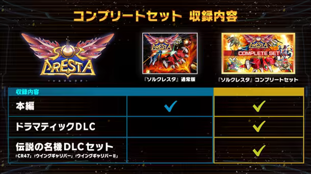 『ソルクレスタ』本編に、大ボリュームのストーリーがボイス付きで楽しめる「ドラマティックDLC」、そして過去のクレスタシリーズに登場した3種の主役機体が使用可能になる「伝説の名機DLCセット」まで加えた、コンプリートセットがお得な新価格で登場!