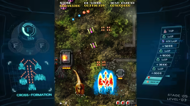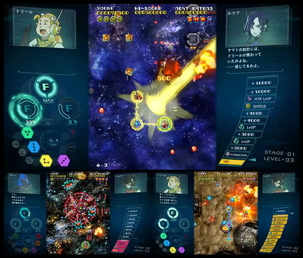 メガ・ゾファーに立ち向かう主役機「ヤマト」は3機の戦闘機によって構成されています。ステージ開始時は1機での出撃ですが、アイテムを獲得するごとに仲間の機体が合流し、強力にパワーアップ! 分離・合体による攻撃性能の変化に加え、複数存在するフォーメーションを駆使することで、より強力で多彩な攻撃を行うことが可能になります。