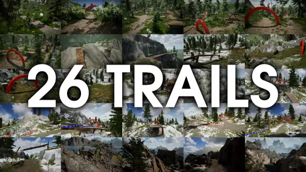 • Explore stunning virtual reality environments and handcrafted tracks, including gnarly downhill runs and technical cross-country trails. Race under different conditions like day, sunset, or at night with headlamps on.