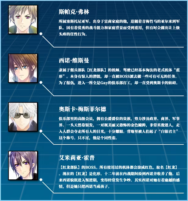 《蓝色形态(Bule Form)》是一款BL向角色扮演。以都市为主要活动地点,在都市与战区之间辗转。在战斗中打败你的敌人,探索地图破解机关谜题推进剧情发展。