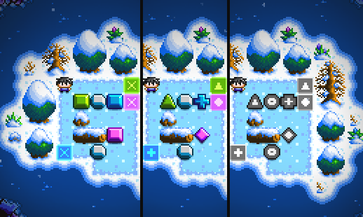 Classic Sokoban uses just one block type. In Puzzledorf, there are different coloured blocks that must reach matching coloured targets, and movable boulders that block your path. Moving them around tight spaces creates a unique challenge that sets Puzzledorf apart.
