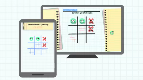 Tic Tac Together is a team-based twist on tic tac toe. Every round, all moves are placed on the board at the same time. If X's and O's are placed in the same space, the teams have to duke it out on a smaller "inner board" to claim it. The game quickly spirals out of control as more inner boards are created and the number of possible moves grows.