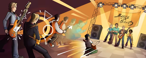 A mashup of puzzle and strategy games. Manipulate four threads of time to guide your band through sokoban-style puzzles. Manage squad resources over a set of limited turns. Experience a homage to 1990s ensemble dramedies. Customize the dynamic soundtrack with audio effects.