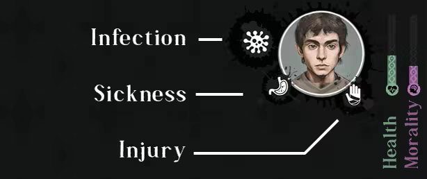 In addition to managing your health, injuries, malaise and infections, the game establishes its own morality landscape where the player has to make difficult choices.