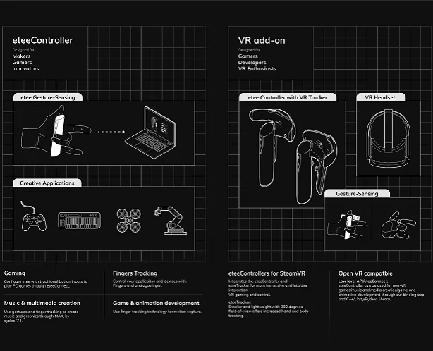 eteeControllers are the first of its kind button-free, finger tracking controller for more immersive and intuitive VR, gaming and DIY projects.