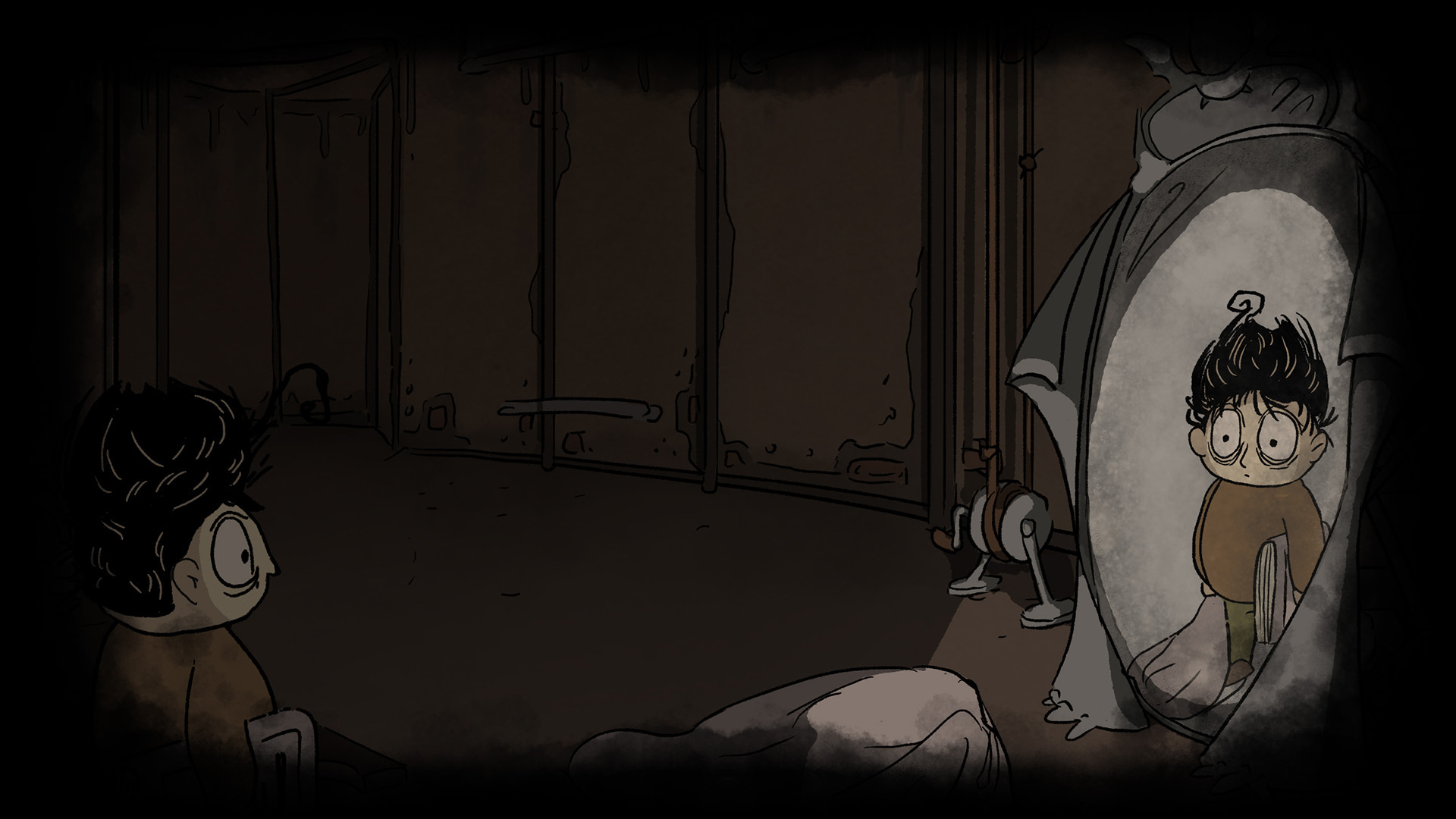 งานศิลปะวาดด้วยมือที่สะท้อนอารมณ์ของห้องใต้ดินเก่าแก่ที่น่ากลัวและแฝงไปด้วยอารมณ์ขันเชิงเสียดสีเล็กน้อย