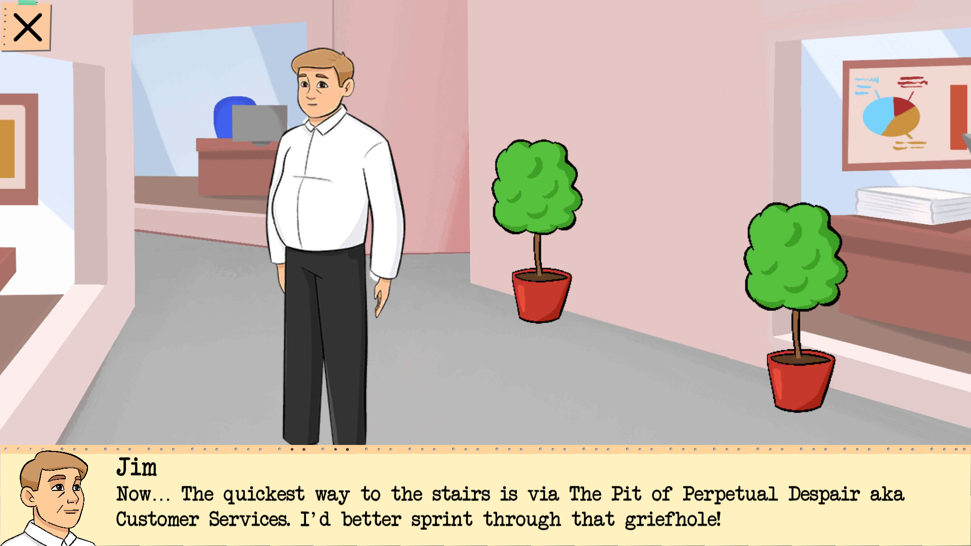 This is the first chapter of a funny kinetic visual novel with minigames where an insurance agent named Jim is sneaking out of the office to meet a girl his dating app matched for him.