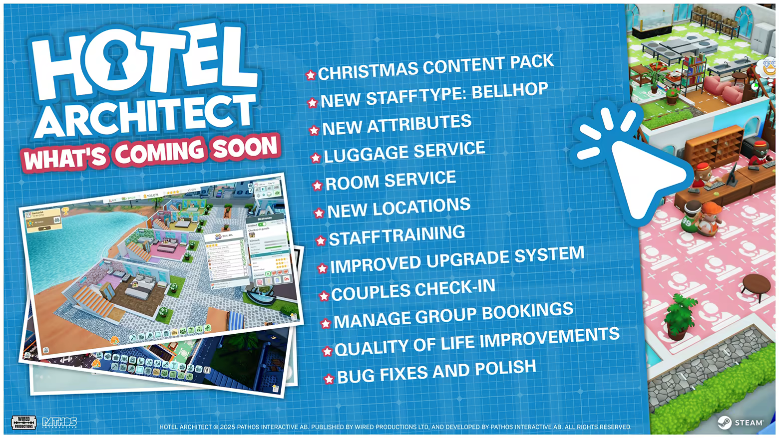 “Our community is vital in the development journey of Hotel Architect. Through various playtests, and into Early Access, Hotel Architect has been shaped by the community who will have a real impact on the final product. As well as this, through our Discord Community and the Steam news and discussions, we will continue to interact, discuss feedback and provide regular updates as the game progresses.”