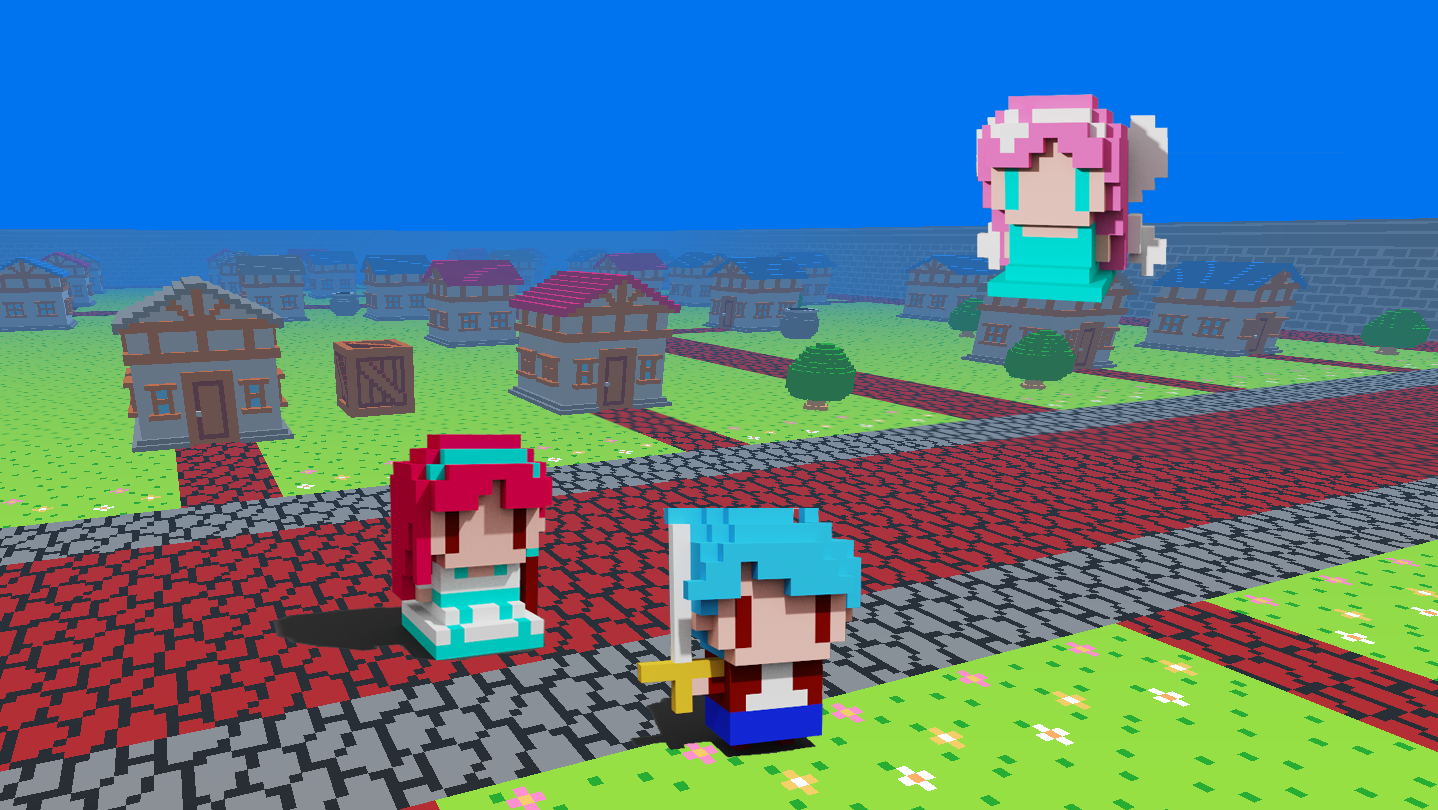 a voxel art world by equipping yourself with various weapons.