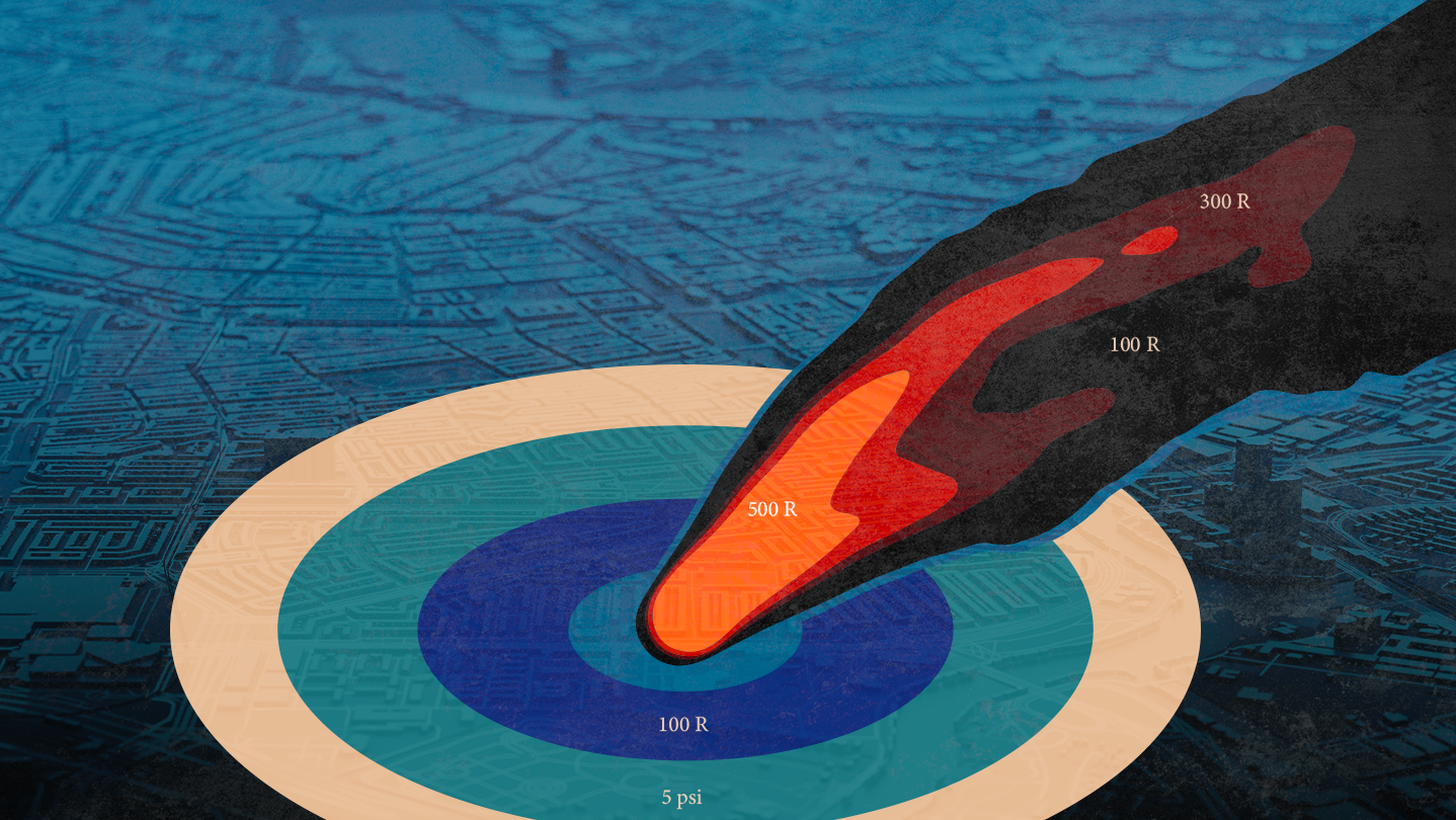 The simulation includes a high-resolution population density grid. The effects of blast, heat, fires and radiation are calculated and visualized for each population cell to estimate fatalities (similar to Alex Wellerstein’s NUKEMAP). The destruction of military targets is simulated using a model considering the CEP of the weapon, target hardness and cratering.
