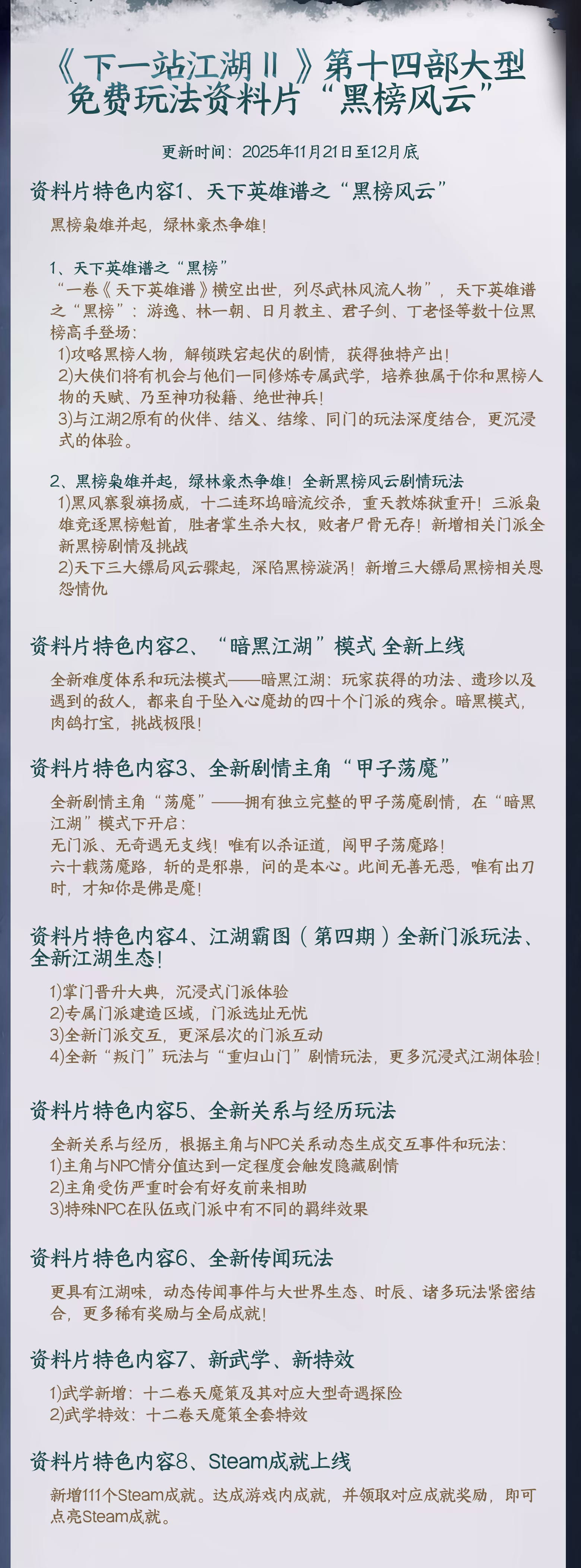(“创新工坊”现已推出,当前已更新14个免费玩法资料片)《下一站江湖Ⅱ》是白玉京工作室研发的第二款3D单机武侠游戏,是一款包含了沙盒式的剧情主角养成、无缝大地图任意采集建造模拟经营、骑砍Like式门派霸图玩法的开放世界游戏,无内购、可离网游玩!